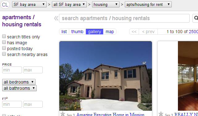 I'm looking for apartments on Craigslist, to both save money and hopefully meet people that won't cut me up and put me in little buckets. I decided I'd write a Craigslist scraper in python using the wonderful beautifulsoup HTML parsing library.