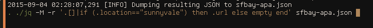 After running this command, all results are stored in sfbay-apa.json. We're now going to use the excellent command-line JSON processor jq to, well, process our JSON.